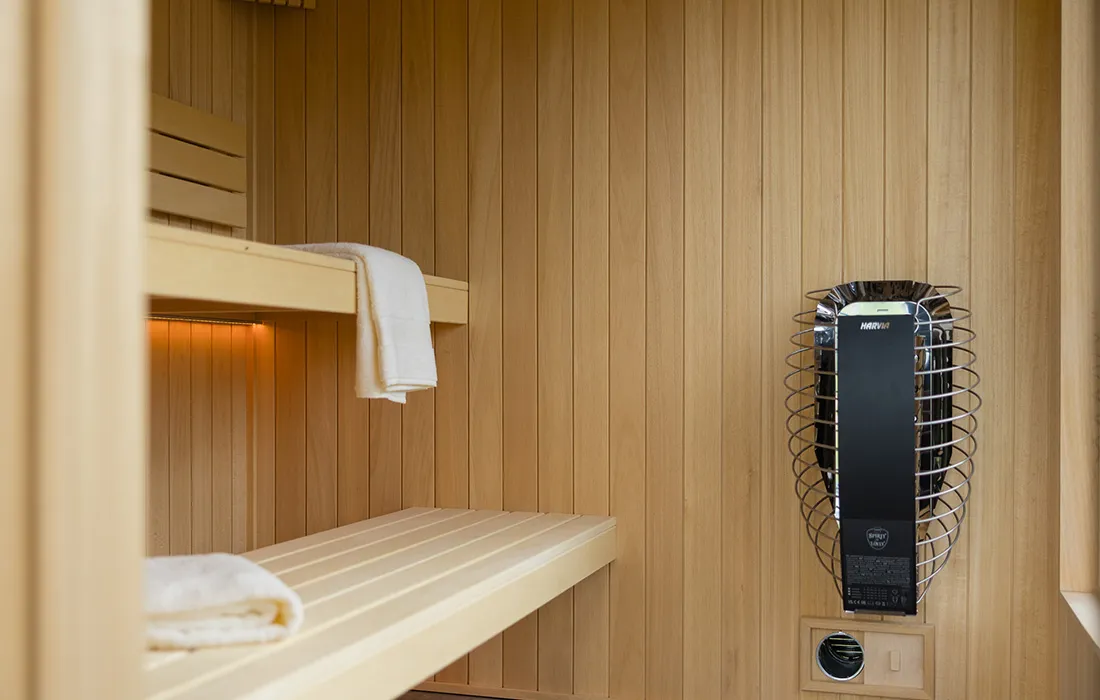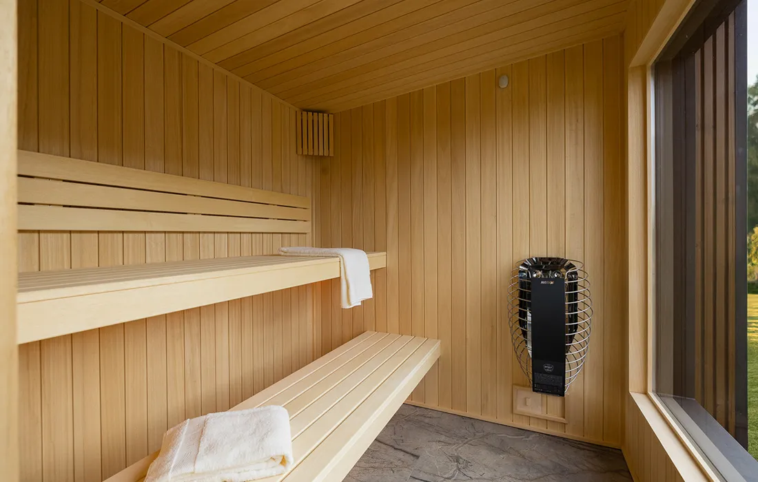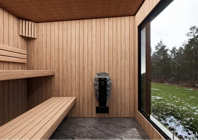 - Piec elektryczny 9 kW – nowoczesny, zapewniający szybkie nagrzewanie sauny do idealnej temperatury.