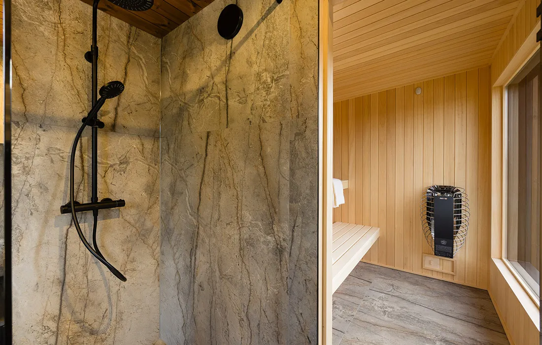 Sauna: Podłoga z płytek Atlas Concorde Empire Silver Root, ściany z boazerii Abachi – wyjątkowy, naturalny materiał, odporny na wilgoć.