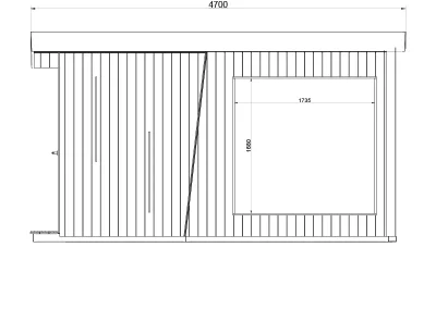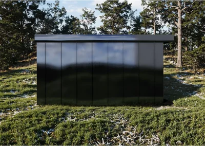 Elewacja zewnętrzna: Wykonana z Thermo Sosny impregnowanej maszynowo dwukrotnie w kolorze czarnym, a dwie ściany wykończono blachą na rąbek.